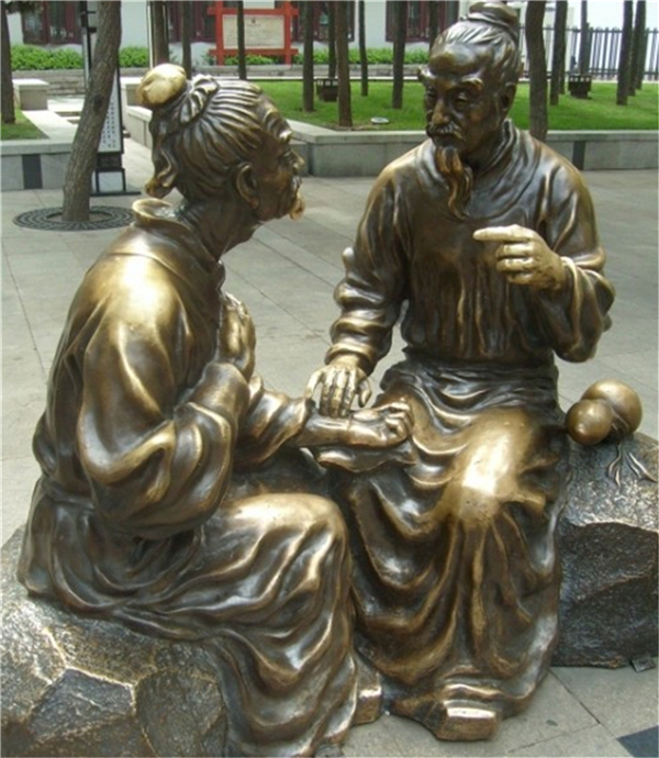 中醫(yī)文化歷史悠久,獨具特色。展現(xiàn)了中醫(yī)在進(jìn)行號脈問診的情景,放置在醫(yī)院或者中醫(yī)診所是很合適的。鑄銅人物雕塑就是以各種銅雕人物為造型的雕刻藝術(shù),用各種可塑材料或可雕,可刻的硬質(zhì)材料創(chuàng)作出一定的可視,可觸的藝術(shù)人物形象。